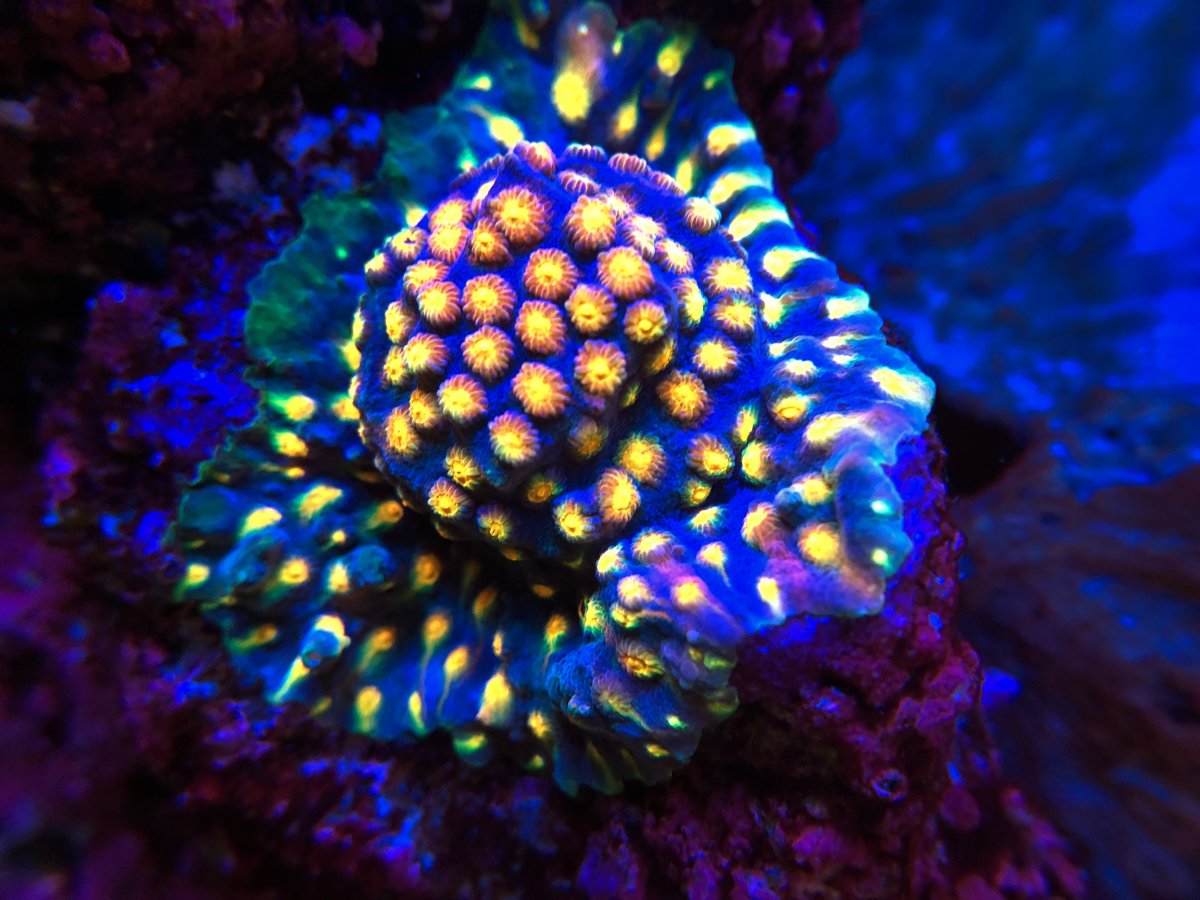 We shoot our pictures under Radion Gen 4 or Gen 5Kessil AP9X under Royal blue and blue setting. The one and only Utter Chaos Zoanthid.